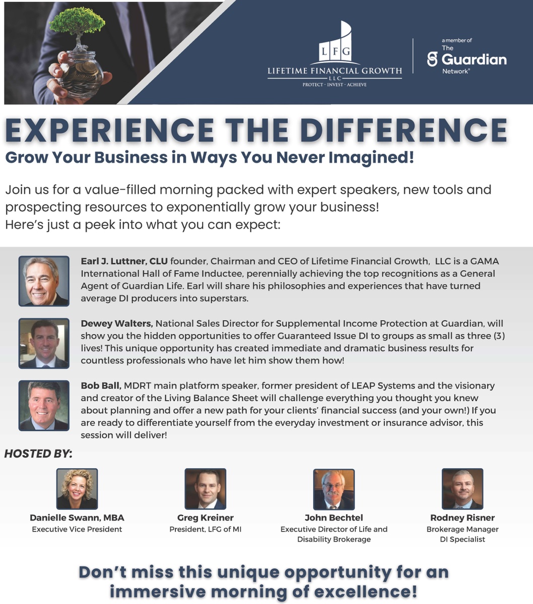 The Living Balance Sheet® (LBS) and the LBS Logo are service marks of Guardian. © Copyright 2005-2023 Guardian. Broker / Agent use only. Not for use with, or distribution to, the general public. The Guardian Network® is a network of preferred providers authorized to offer products of The Guardian Life Insurance Company of America (Guardian), New York, NY and its subsidiaries. Lifetime Financial Growth is an independent agency and not an affiliate or subsidiary of Guardian. 2023-156224 Exp. 06/28/23